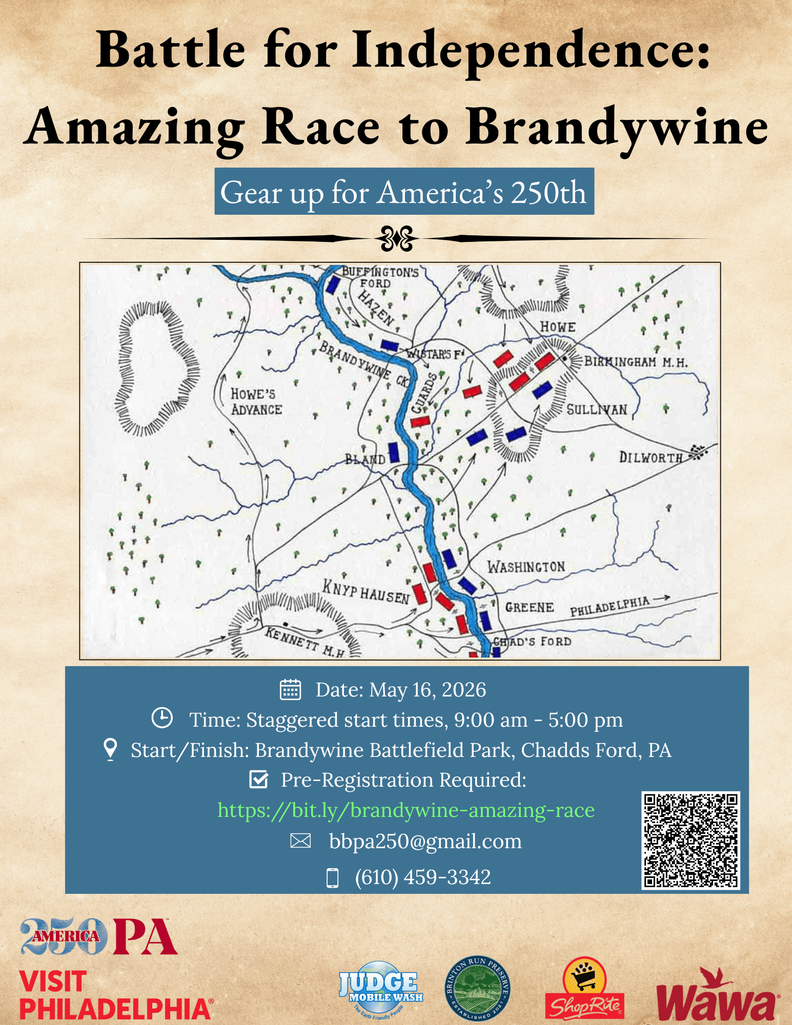 Gear up for America’s 250th! Explore the Brandywine Battlefield with family and friends in an untimed road rally. Discover key historic sites, meet costumed interpreters, and learn how the largest single-day battle of the Revolution shaped our fight for independence.